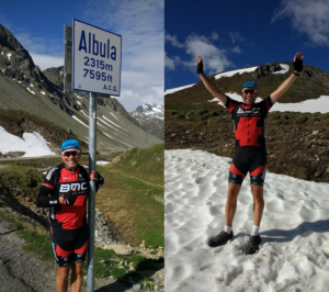 Slovenia made a hugely positive impression, with its wonderful scenery and total lack of litter. The first full day of cycling saw Austria arrive via a tunnel that Hitler built, using concentration camp slave labour, to keep his southern flank better supplied. Respects were paid at the memorial and on we travelled. The next country was difficult to spot but we entered the staunchly German-speaking area of Italy and spent many hours cycling through apple and plum orchards. The best campsite of the trip, with a wonderful freshwater, mountain-fed swimming pool led to the first day off. Then on to Switzerland, where the hard climbing started. Getting a heavy touring bike up a big hill simply requires persistence and a strong personal discipline not to look up! We were heading for the Albula Pass, but had to cross several increasingly demanding“foothills” to get there. Our final “assault” required a 600 meter climb – it took us nearly 3 hours of constant weaving for a horizontal gain of just over 8kms! But what a reward; snow, stunning views, a new fridge magnet from the café/gift shop and a huge sense of satisfaction reinforced by the knowledge that it was predominantly downhill for the rest of the trip.