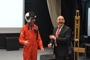 After a 40 minute talk, interspersed with lots of flying videos put to obligatory rock music, and some excellent questions from the pupils such as ‘do you have to pay for the plane if you crash it?’ and ‘what is the spike on the front of the aeroplane for?’ the Headmaster, Mr Ian Brierly, had an opportunity to show the kids how cool he looked in a full Red Arrows flying suit and helmet!