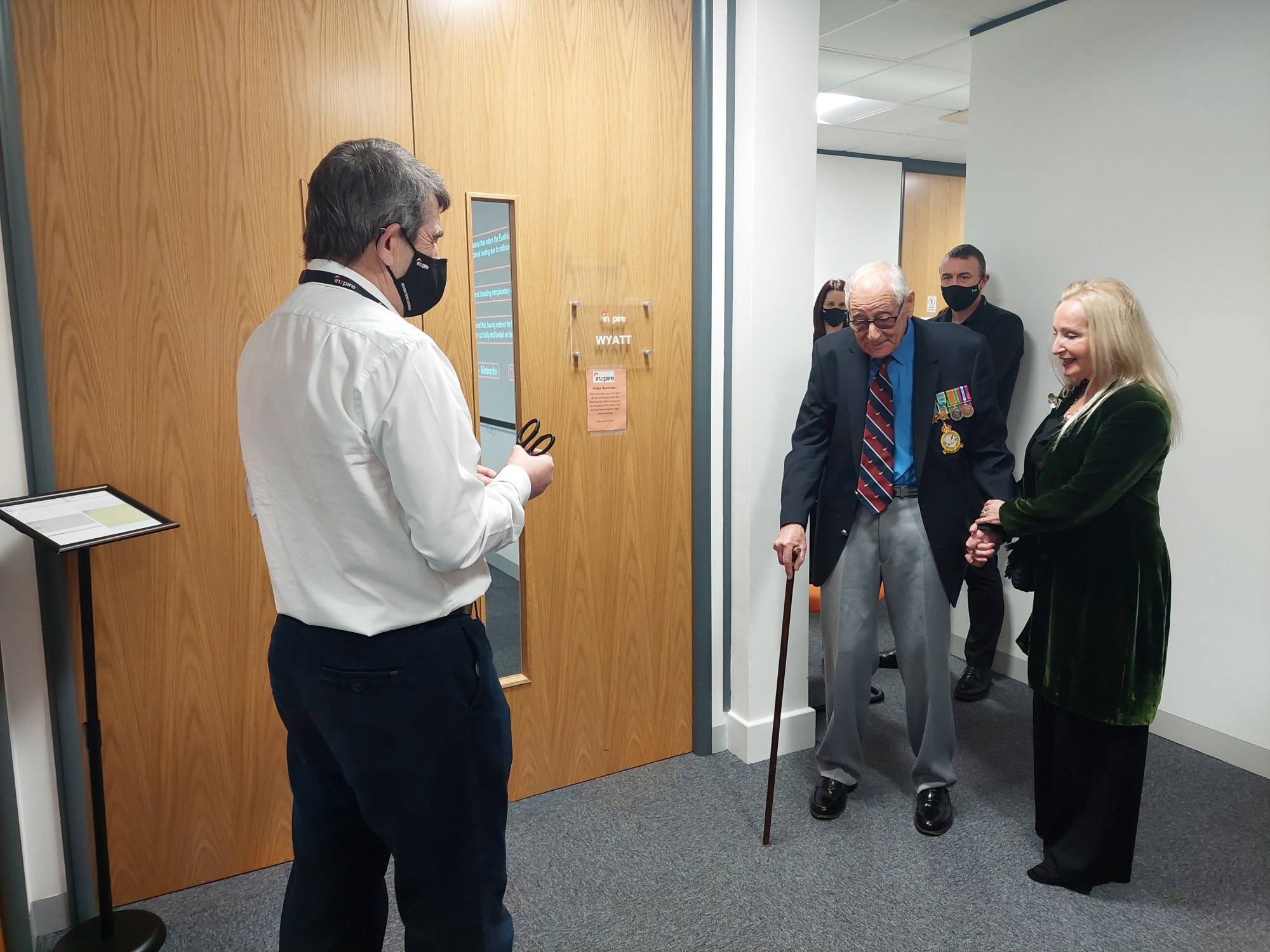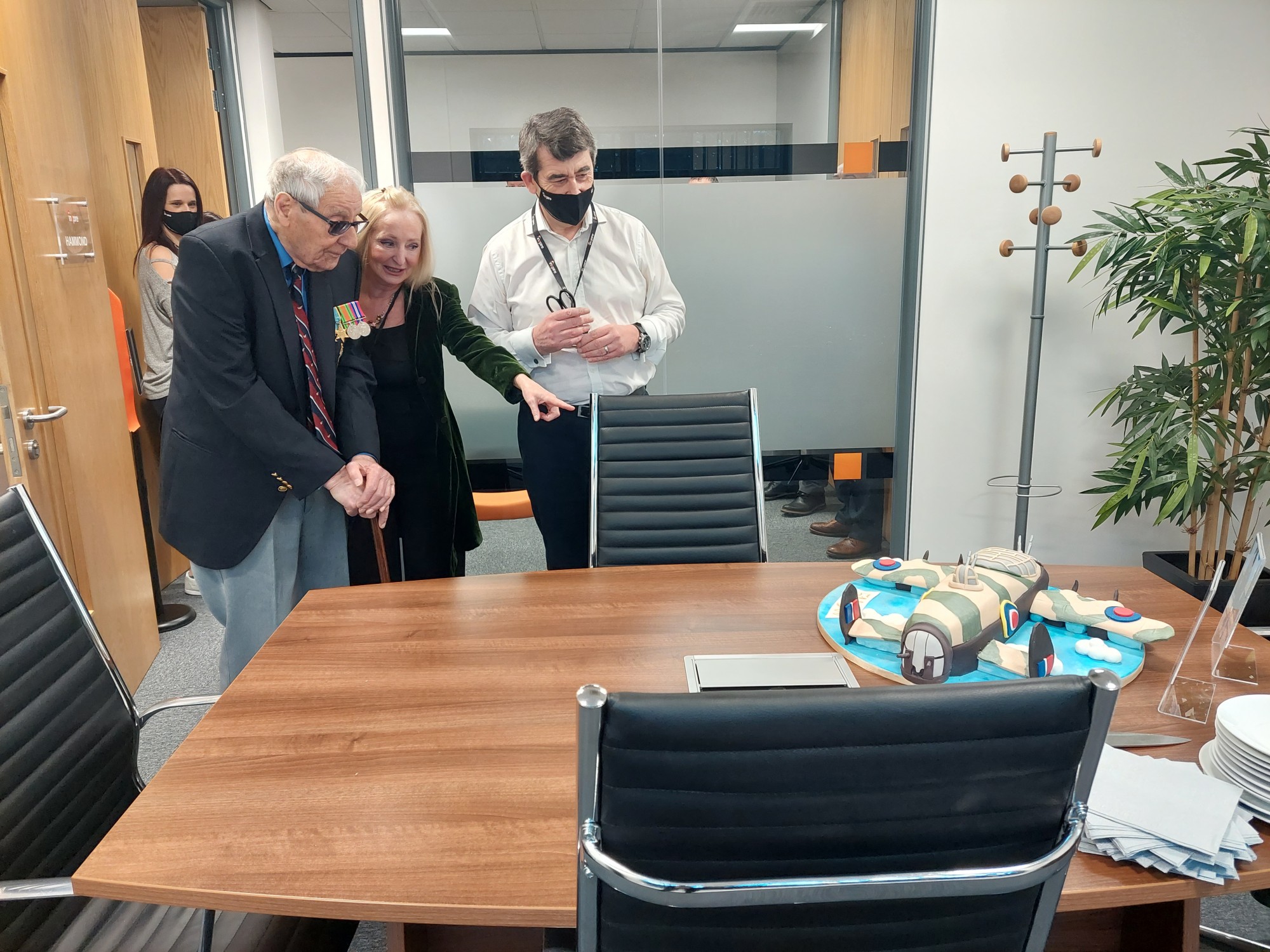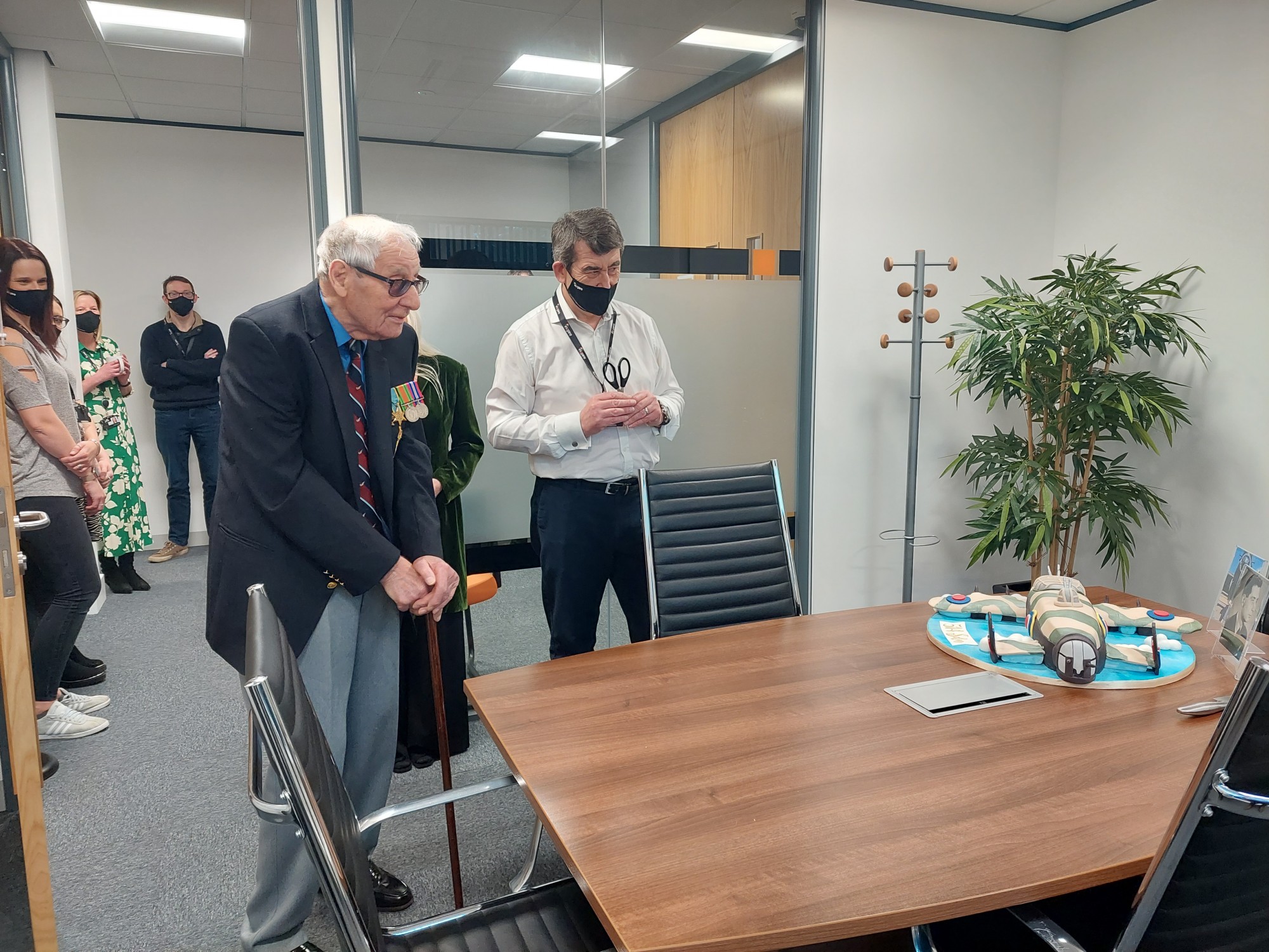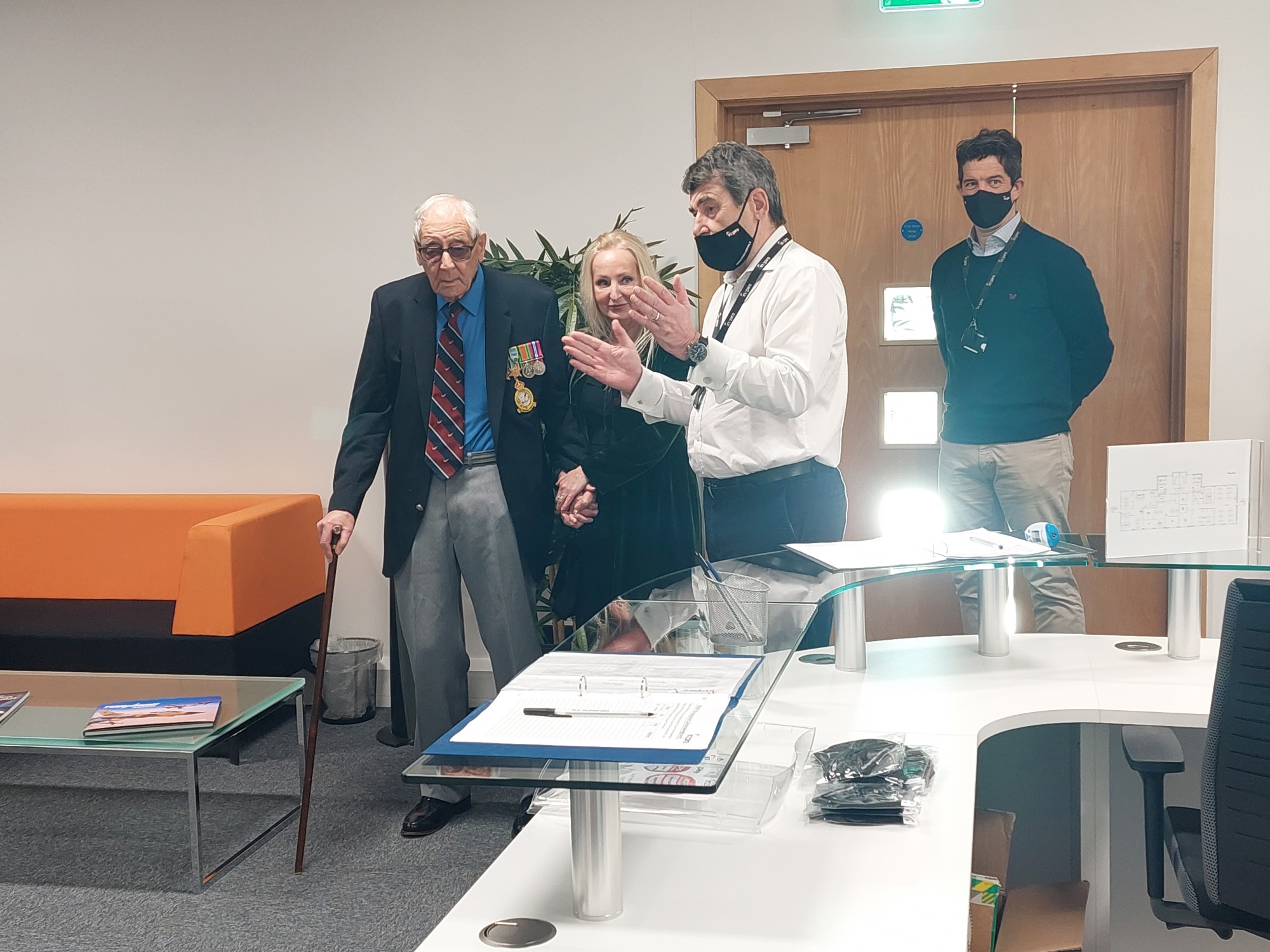 Bert visited the offices to officially open the room named in his honour and to learn more about Inzpire and its strong connections to the defence industry. He spent time chatting to many members of the team sharing personal anecdotes about his experiences, received a GECO demonstration and expressed his frustrations around being a Norwich City F.C. fan! Bert also enjoyed a very special 514 Sqn Lancaster Bomber cake.