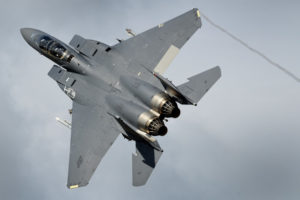 A 492nd Fighter Squadron F-15E Strike Eagle flies over Royal Air Force Lakenheath, England, Aug. 17 in support of Typhoon Warrior. (Image courtesy of U.S. Air Force/Tech. Sgt. Matthew Plew)