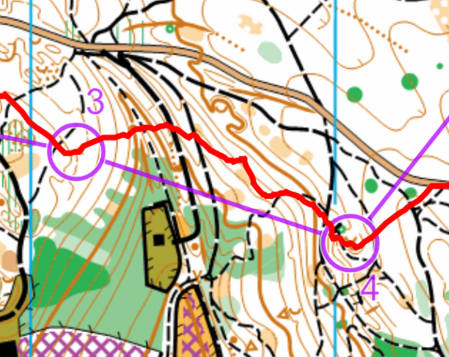 Philip’s route in red vs the ‘racing line’ in purple between control 3 & 4 and the paths to the north with less change in height