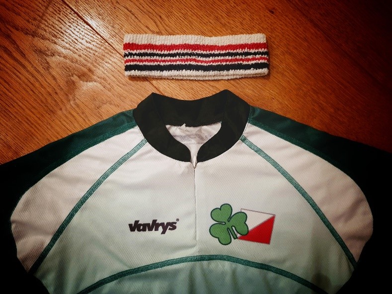 The Ireland Orienteering kit plus Philip’s father’s headband from his international rugby playing days, which Philip wore during this competition