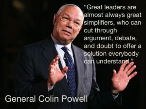 Leaders use simple clear language. It is important for leaders to communicate clearly and simply and to be able to reduce complex ideas to simple concepts that people can actually understand. Communication is definitely one of the key skills of leadership. Einstein agreed with this philosophy when he said, “everything should be as simple as possible, but not simpler”. Coco Chanel referred to “simplicity being the ultimate sophistication”. And General Colin Powell noted that, “Great leaders are almost always great simplifiers”. My rule of thumb is now: simplify, simplify, simplify.