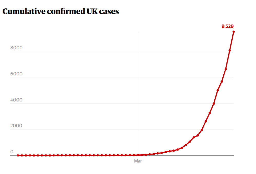 A graph showing U.K cases as at 25 March, from https://www.theguardian.com/world/2020/mar/25/uk-coronavirus-mass-home-testing-to-be-made-available-within-days It is no surprise that these graphs looks similar