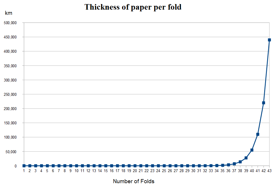 A graph showing the thickness of paper folds, from http://wwvv.codersrevolution.com/blog/will-a-piece-of-paper-folded-42-times-reach-the-moon