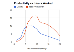 The graph below is from a study Jeff Sutherland refers to in Scrum. It shows that not only is productivity affected by working long hours, but so too is quality. Every graph on this subject shows the same thing; they all agree that after about 47 hours work in any week, you are heading back down towards production levels similar to those you would have achieved at the 20 hour point!