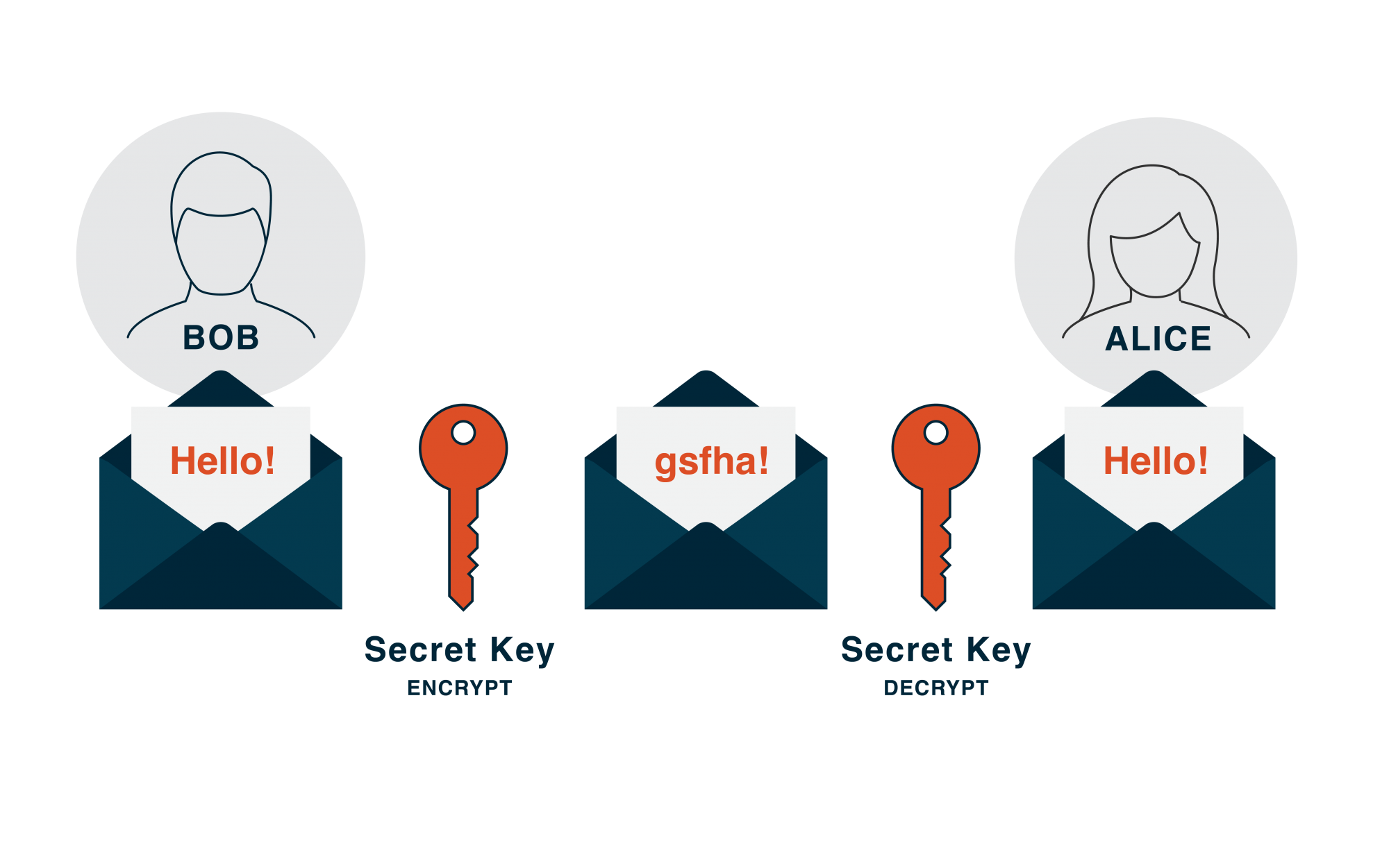 With symmetrical key encryption, Bob and Alice share the same encryption key which they both must keep a secret – the encryption key is basically a string of random characters that alter the plain data to make it unreadable for anyone else. It is shared using a key exchange method such as Diffie-Hellman (a mathematical algorithm).